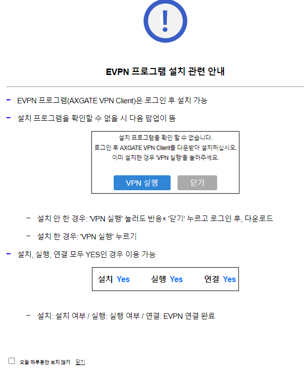 ๊ฐ. ๋จผ์ ์ง์ Evpn ๋ฐ ์ ๋ฌดํฌํธ์ ์ ์์ ์ผ๋ก ์ ์์ด ๋๋ ๊ฒ์ ํ์ธํ ์ดํ์, ๋ณธ ํ๋ก๊ทธ๋จ์ ์ฌ์ฉํ์๊ธฐ ๋ฐ๋๋๋ค. ๋ณธ ํ๋ก๊ทธ๋จ์ AXGATE VPN Client ๋ฐ ๊ธฐํ ์ ๋ฌดํฌํธ, ๋์ด์ค์ ๊ด๋ จํ ํ๋ก๊ทธ๋จ๋ค์ด ๋ชจ๋ ์ค์น๋ ์ปดํจํฐ์์ ์ ์์ ์ผ๋ก ์๋ํฉ๋๋ค.
