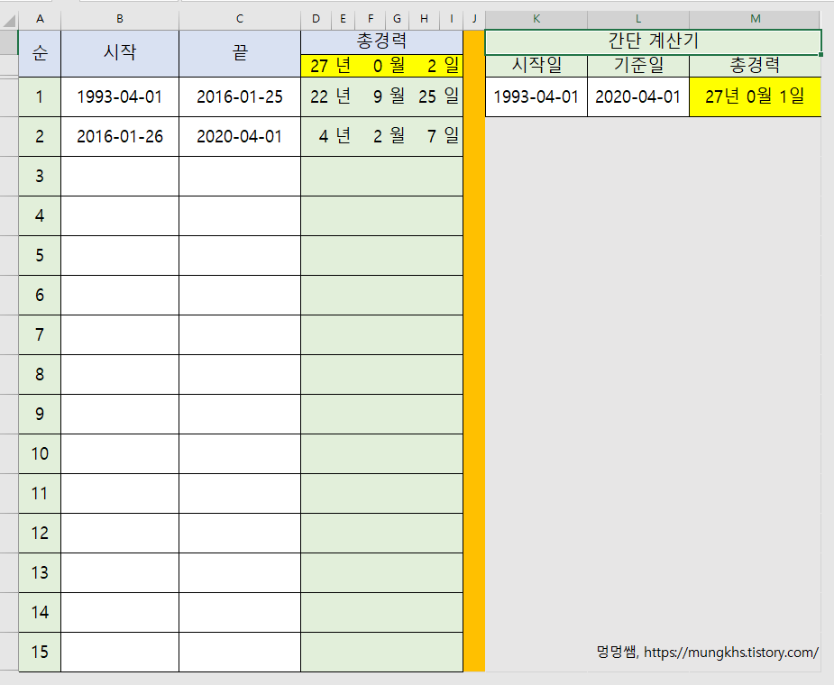 ์ฐธ๊ณ ๋ก ์์ ํจ์ ์ค์ DATEDIF ๋ผ๋ ํจ์๋ฅผ ์ฌ์ฉํ์ต๋๋ค.