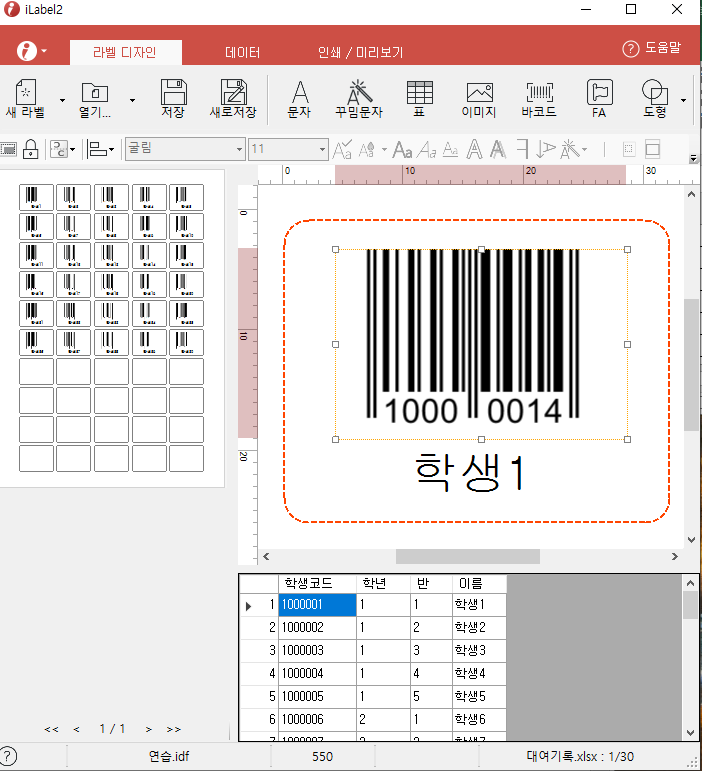 ์๋ ๊ทธ๋ฆผ์ ์์ด๋ผ๋ฒจ2 ํ๋ก๊ทธ๋จ์ ํ์ ๋ฐ์ฝ๋๋ฅผ ๋ง๋๋ ๊ณผ์ ์ ๋๋ค. ์์๋ ๋ฐ์ฝ๋ ์ข ๋ฅ๋ฅผ EAN-8 ํํ๋ก ๋ง๋ค์ด์ ๋ฐ์ฝ๋์๋ 8์๋ฆฌ ์ซ์๊ฐ ๋ํ๋์ง๋ง, ์ค์ ์ฝ๋๋ ๋งจ ๋ท์๋ฆฌ(๊ฒ์ฆ๊ฐ)๋ฅผ ์ ์ธํ 7์๋ฆฌ ์ซ์์ ๋๋ค. ๊ทธ๋์ ์์ ํ์ผ์๋ 7์๋ฆฌ๋ง ์ ๋ ฅ๋์ด ์์ต๋๋ค.